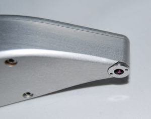 Close-up of the BLS ballistometer probe tip from the side, where the underside and the stylus is visible